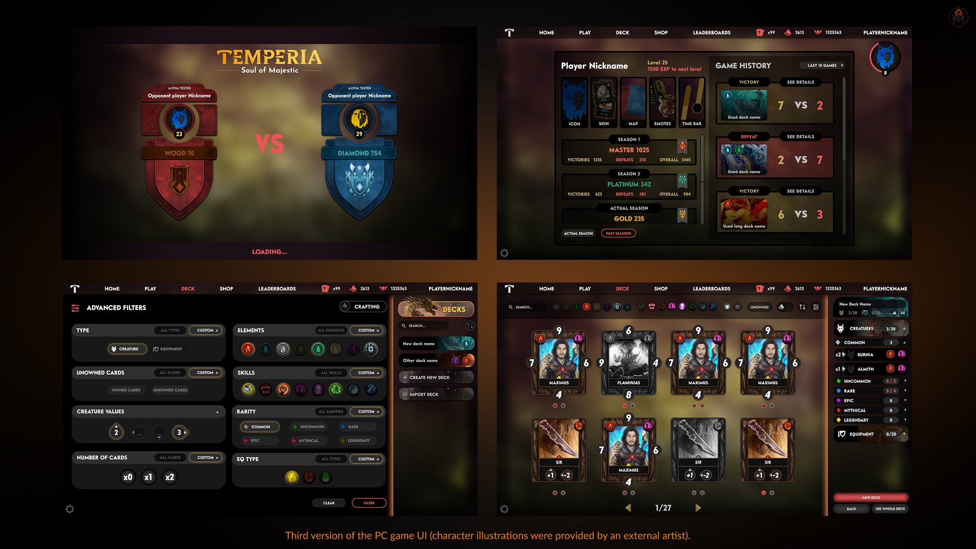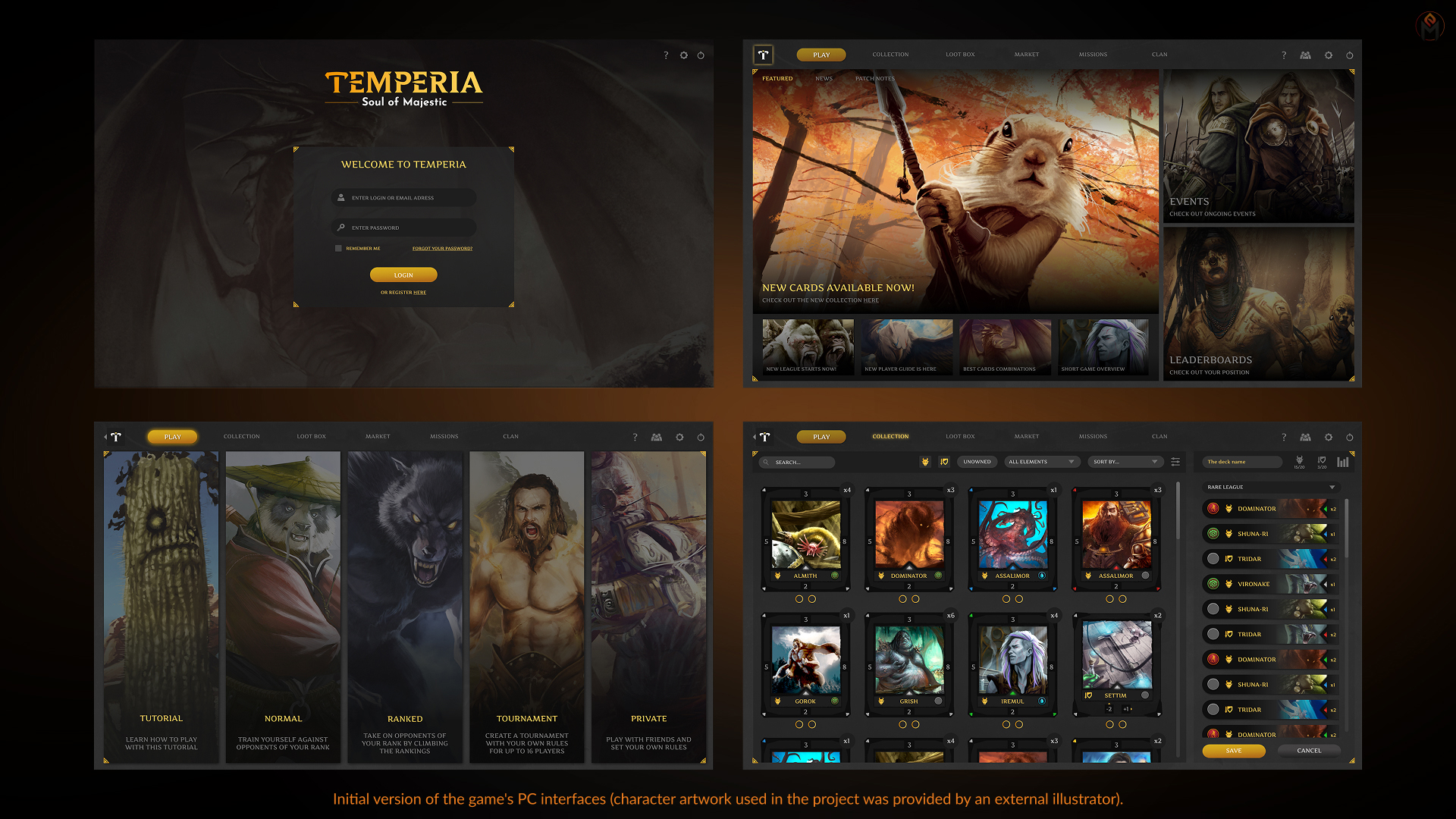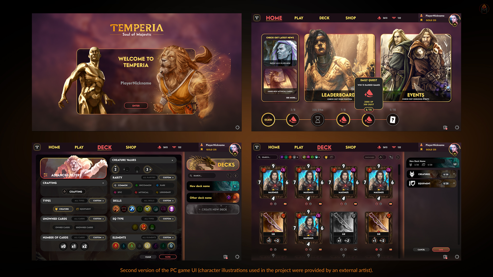 Temperia: Soul of Majestic to strategiczna gra karciana, stworzona na zlecenie streamerów i autorów oryginalnej koncepcji. Nasz zespół odpowiadał za pełne opracowanie gry w cyfrowej formie – od projektu interfejsów po implementację rozgrywki. Tytuł inspirowany klasycznymi TCG wyróżnia się unikalną mechaniką open-handed (pełna widoczność kart przeciwnika), która premiuje strategię zamiast losowości.